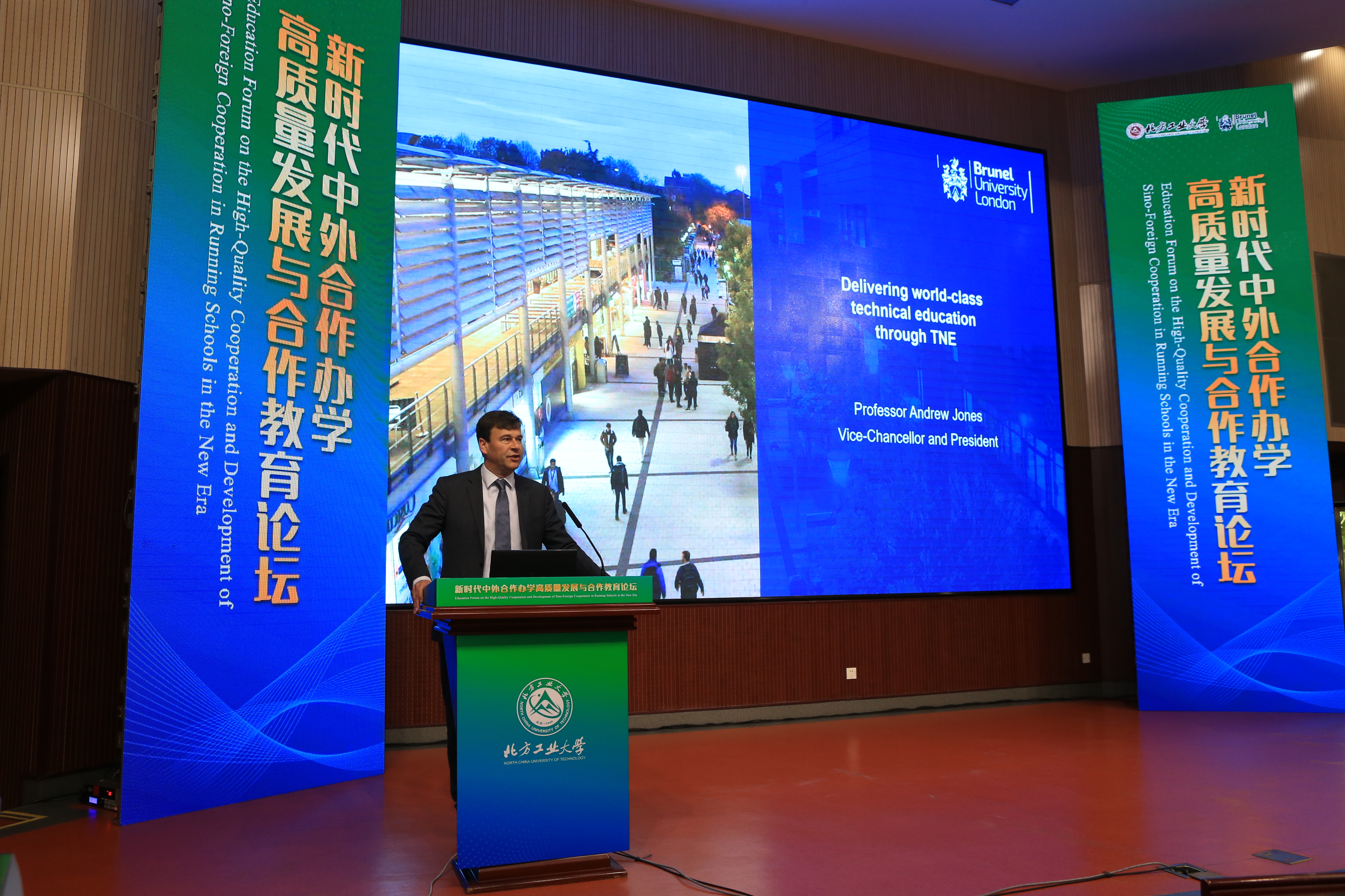 Andrew Jones教授发表了“Delivering world-class technical education through TNE”主旨演讲,以英国高等教育国际化为切入点,探讨了新时代下中外合作办学的发展趋势和机遇,重点分析了中英两国高校在科学研究和人才培养合作的良好基础及未来展望。