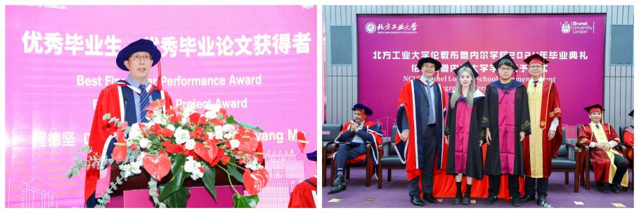 Maozhen Li主持学位授予仪式。102名毕业生依序上台,与两校长合影留念,现场领取伦敦布鲁内尔大学的学位证书。